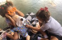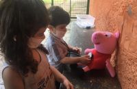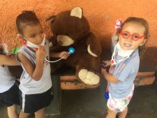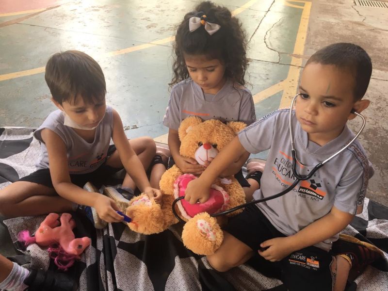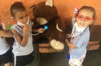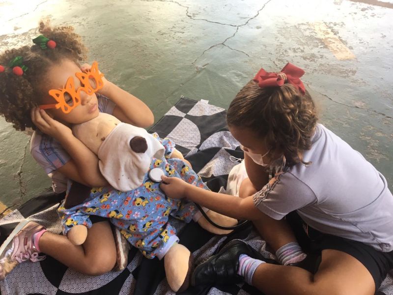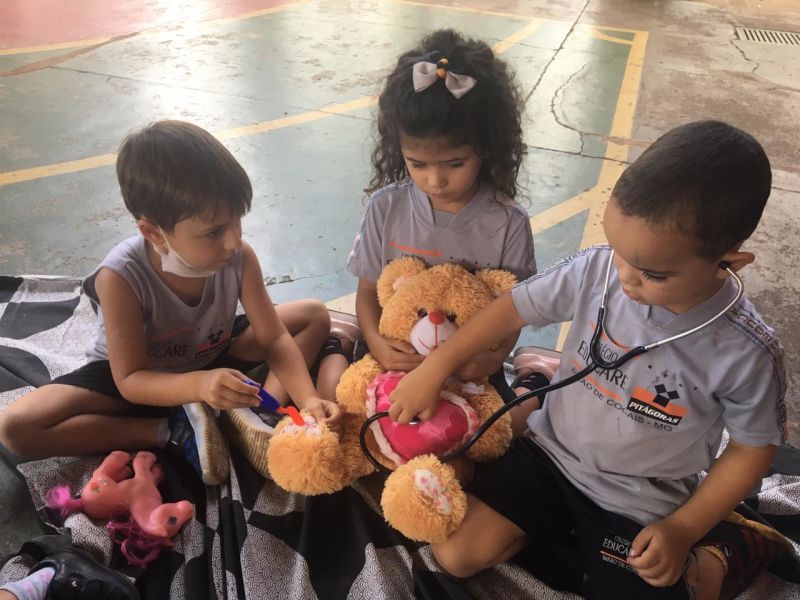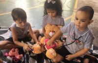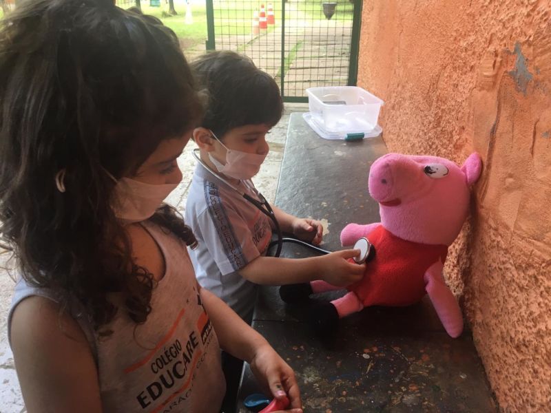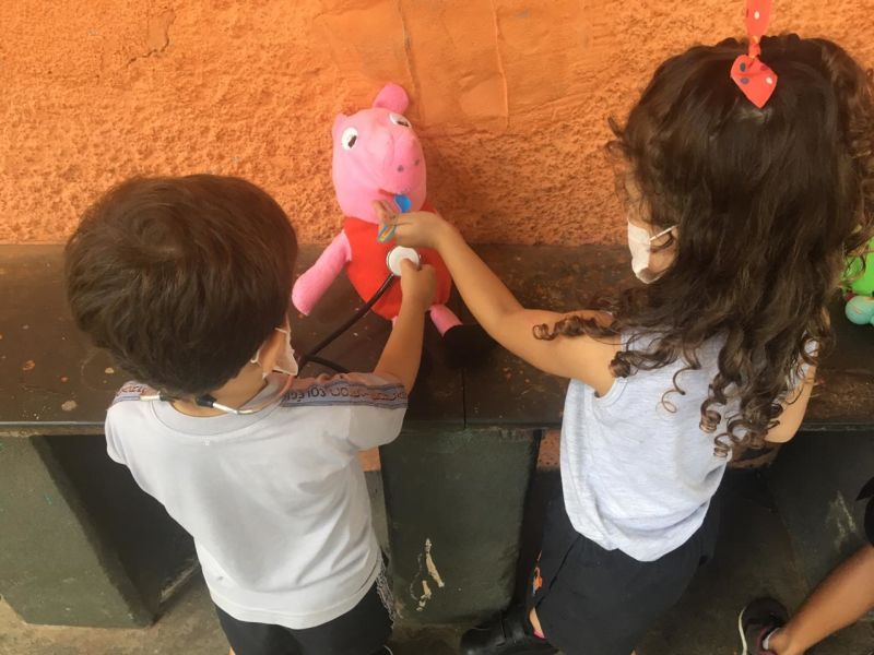 Durante a brincadeira elas cuidaram do cachorro com a pata machucada,deram vacinas nos ursos, olharam o ouvido da porquinha Peppa, além de conferir os batimentos cardiácos de todos os animais.