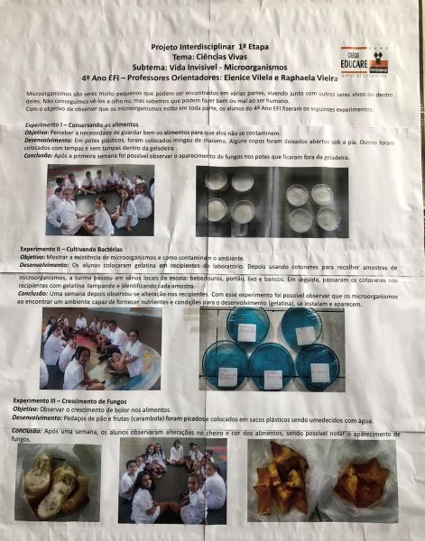 Por meio do projeto Ciências Vivas, o Colégio Educare promoveu o desenvolvimento da criatividade e da capacidade investigativa nos estudantes do turno da tarde. Desde o Pré-Maternal ao 5º ano a meninada utilizou a pesquisa e a experimentação como ferramenta para adquirir conhecimento.