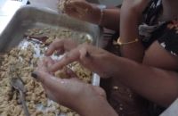 Unte as mãos com manteiga e misture a massa até ficar no ponto de enrolar. Unte as mãos com manteiga, faça as bolinhas e envolva no granulado.