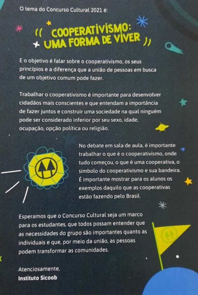 O Colégio Educare está participando do Concurso Cultural “Cooperativismo: uma forma de viver 2021” que tem a finalidade de difundir o conceito de cooperação para as crianças do Ensino Fundamental I, motivando-as a se tornarem mais conscientes.