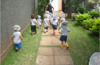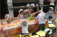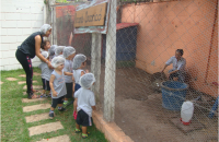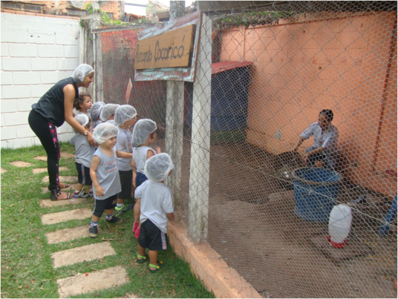 Observe o bolo que a meninada fez na varanda da culinária. Até usaram os ovos das galinhas do galinheiro da escola.