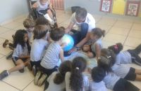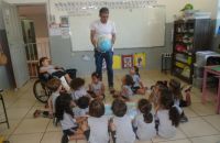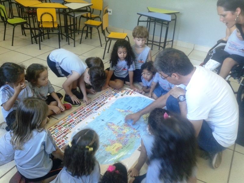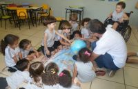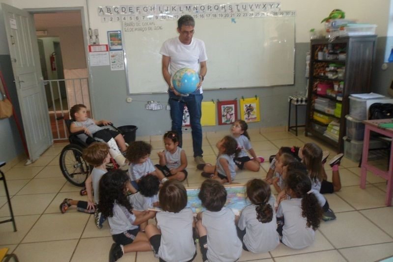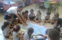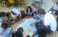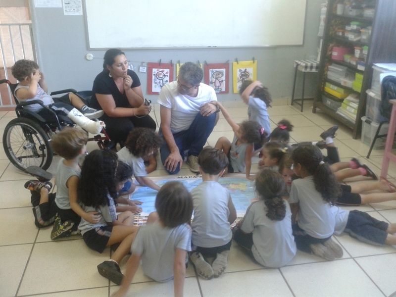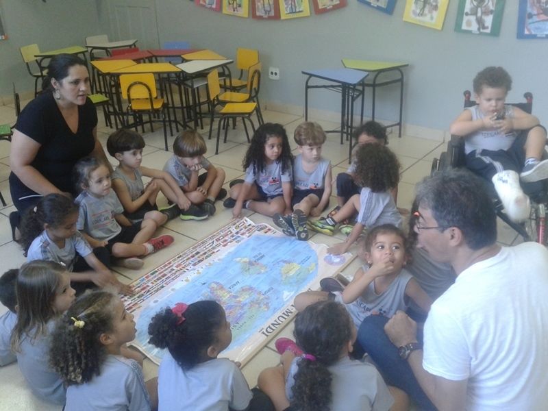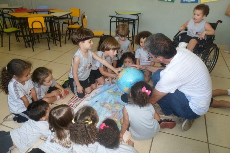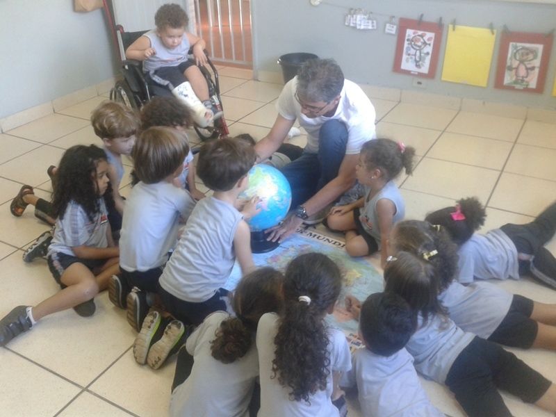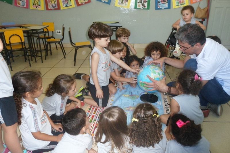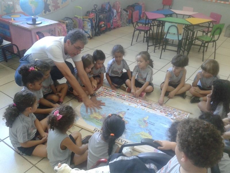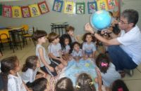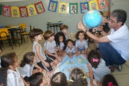 Os alunos do Iº Período estão pesquisando sobre a descoberta do planeta Terra. E foi com muita alegria que receberam o Prof. Leandro de Geografia e História que chegou com o mapa mundi e o globo terrestre e mostrou a localização do Brasil e a floresta amazônica, os pólos norte e sul, os continentes , oceanos e ilhas, onde está localizado o maior deserto do mundo e os países que têm vulcões.